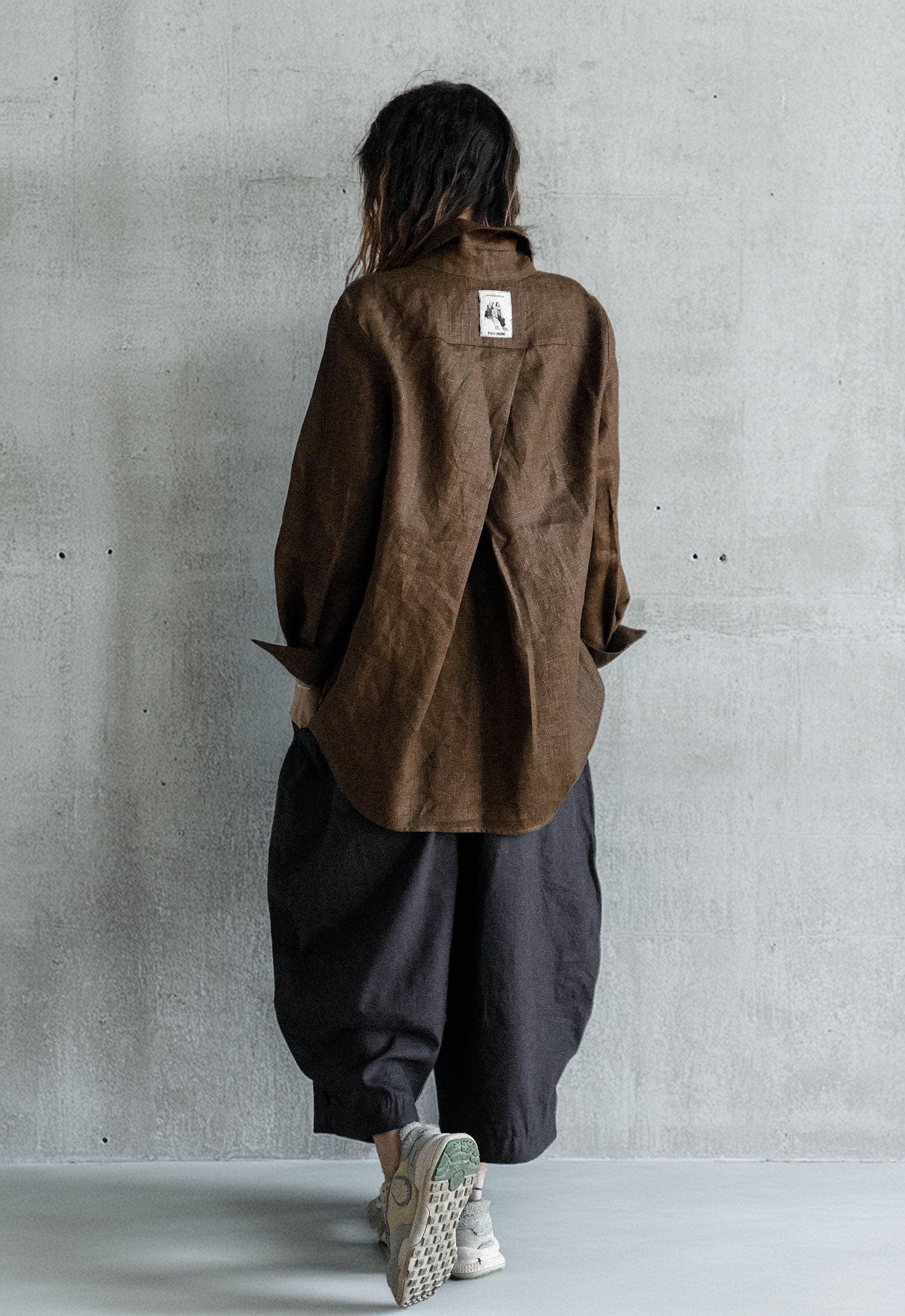 Relaxed, sculptural linen trousers with a soft elasticated waistband for an easy, comfortable fit. The silhouette is wide and slightly rounded, creating a modern, airy shape that moves beautifully with the body. Designed with deep side pockets and distinctive oversized back pockets, they combine practicality with a minimalist, Japanese-inspired aesthetic.