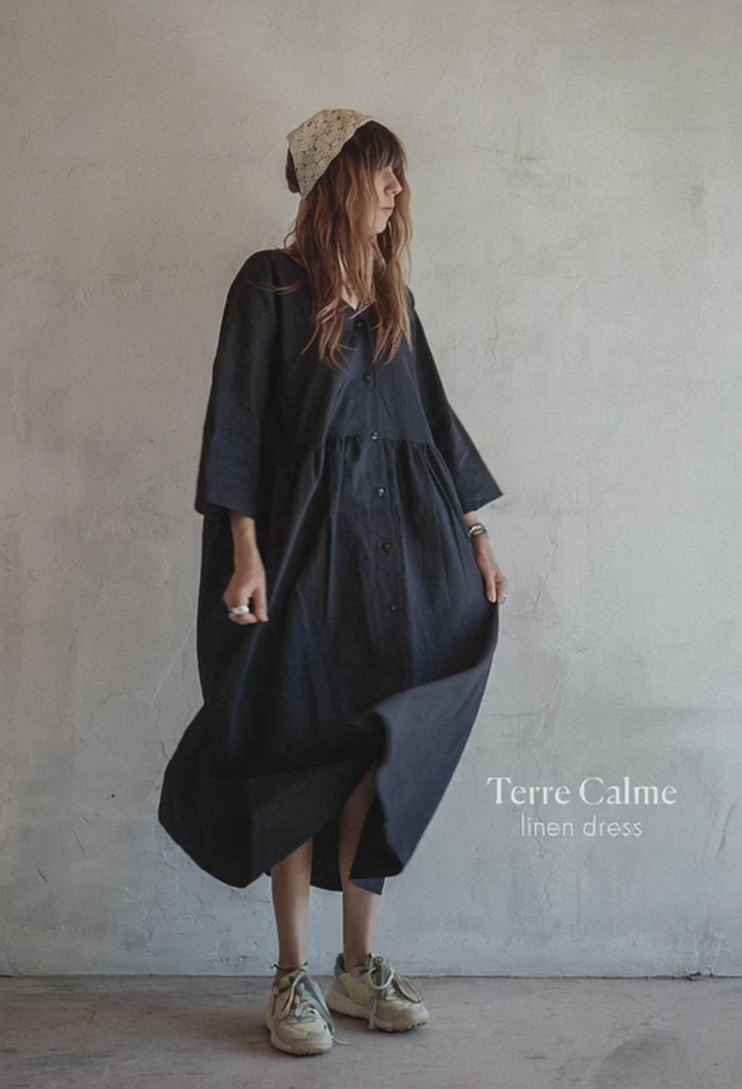 The Field Study dress is a quiet silhouette made for slow movement — inspired by the ease of long walks, shaded notebooks, and open sky. Cut from weighty, breathable linen, it falls loosely over the frame with a gentle gathered waist and wide, cropped sleeves.