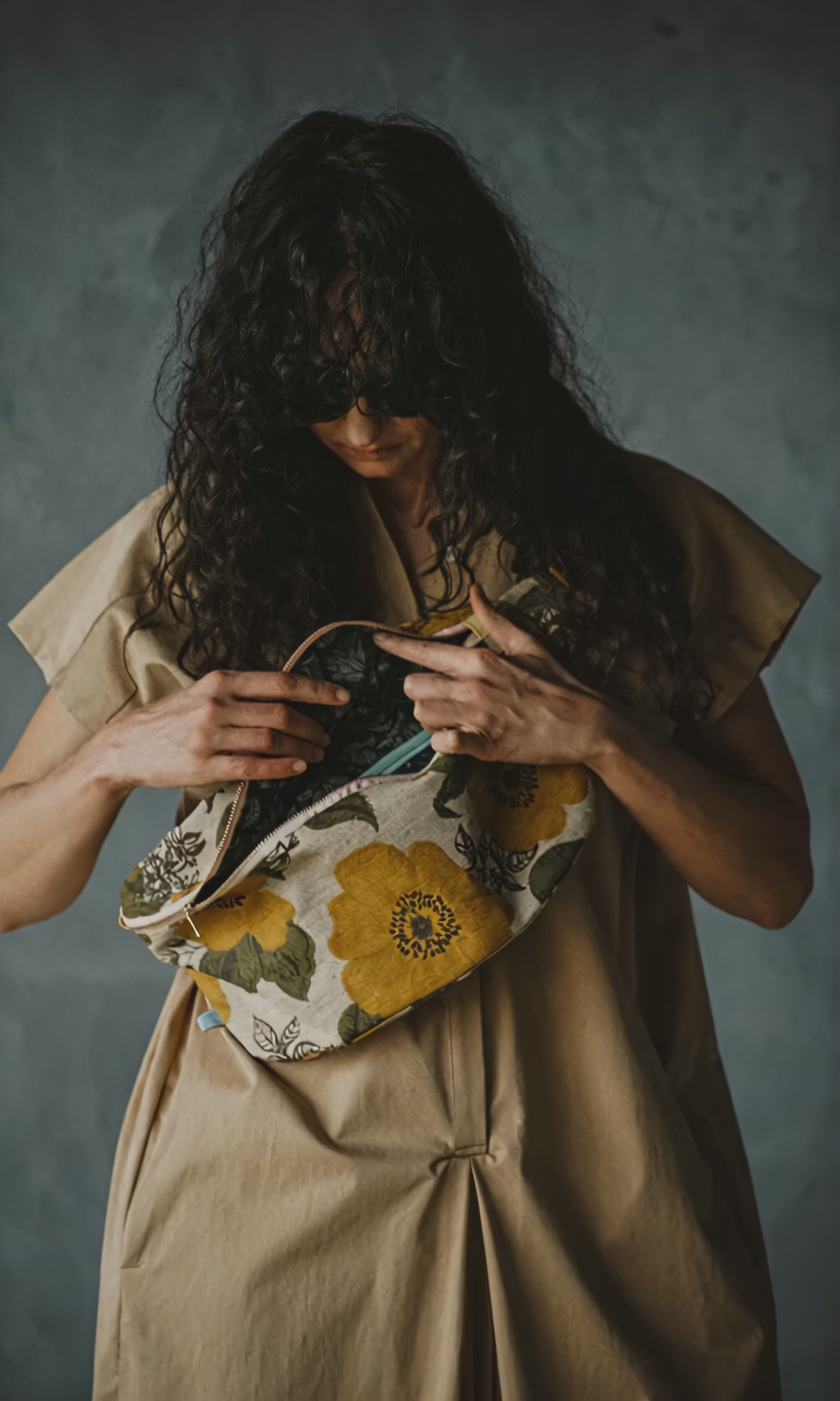 The bum bag features a bold, vintage-inspired floral pattern with large yellow flowers and green leaves against a textured fabric. It has a convenient zipper for secure storage. The overall design exudes a bohemian and retro vibe, perfect for adding a touch of nostalgia to any outfit. It’s stylish, practical, and ideal for those who love a classic, carefree aesthetic.